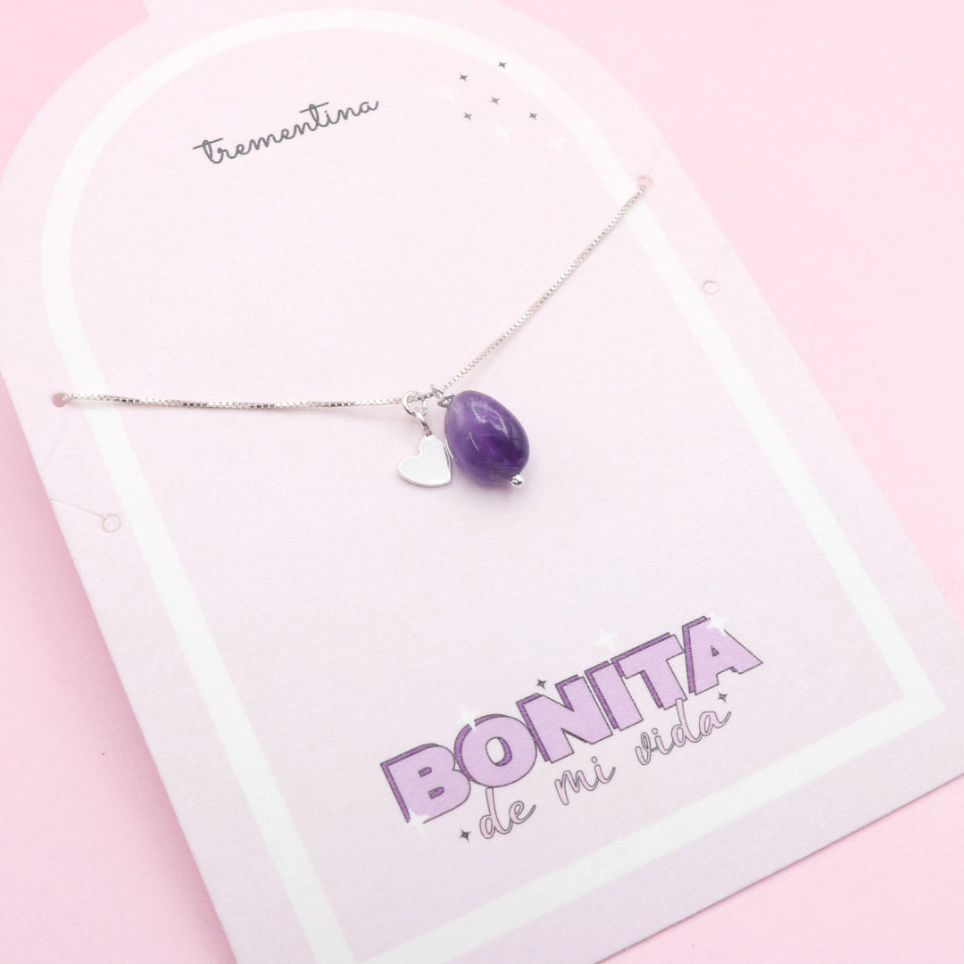 Este collar con piedra amatista y dije de corazón simboliza calma, amor y buena energía. Perfecto para recordarle a esa persona o a ti misma lo bonita que es por dentro y por fuera.