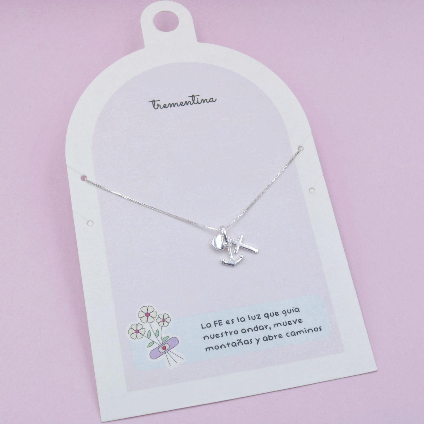 Este collar dorado combina una cruz, un corazón y un ancla, símbolos de confianza, amor y estabilidad.