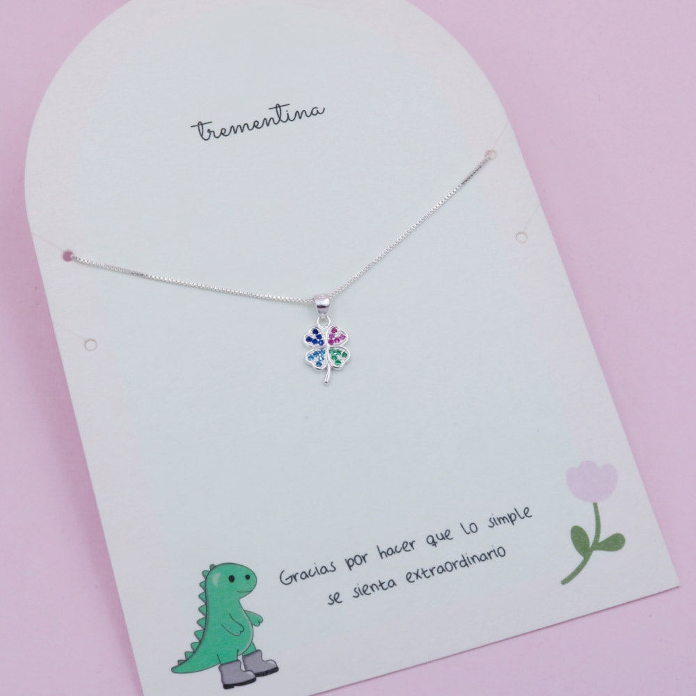 Este collar trébol de la suerte en Plata de Ley 925 es una joya delicada y llena de significado. Su dije en forma de trébol está decorado con circones multicolor, que aportan brillo sutil y un toque alegre sin perder elegancia.