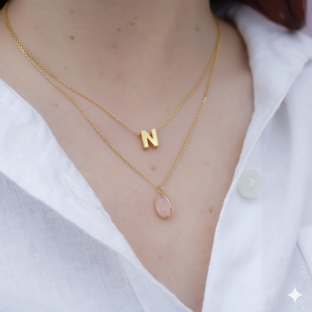 Collar Doble Dorado Letra y Cuarzo Rosa