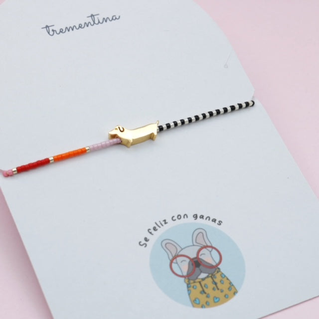 Pulsera Hilo Mostacilla Perrito Salchicha Dorado