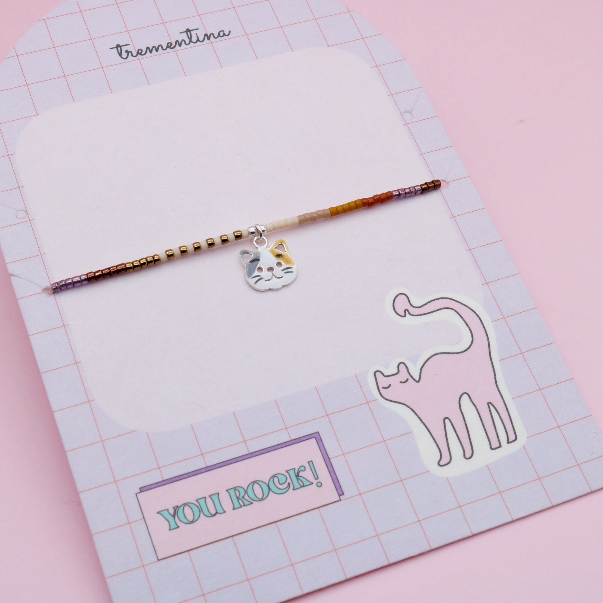 - Elaborada con mostacillas Miyuki en tonos tierra y un dije de gatito en acabado plateado.