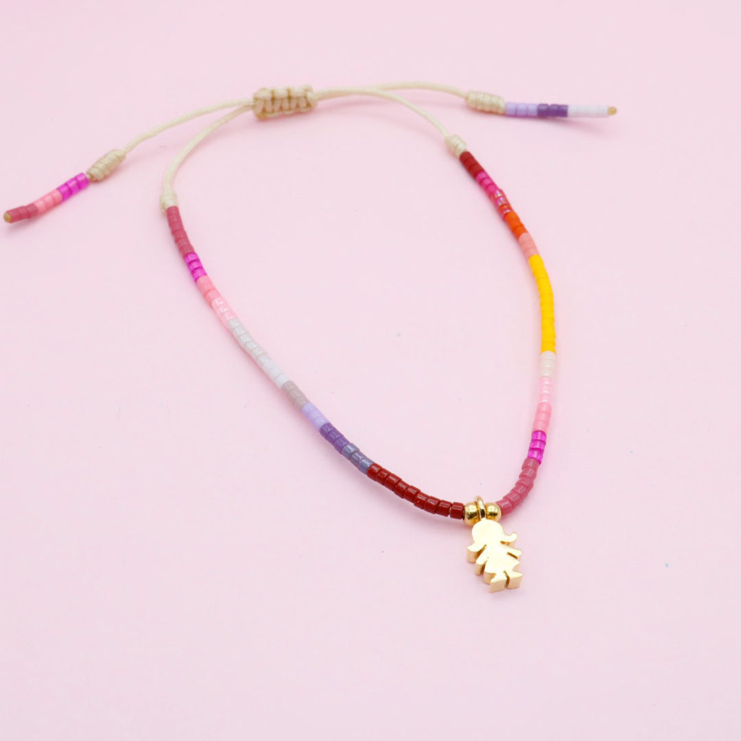 Pulsera hecha a mano con mostacillas en tonos pastel y multicolor, con dije en baño de oro que simboliza a un hijo. Diseño delicado, ajustable y liviano, ideal para llevar todos los días como recordatorio de ese amor incondicional.