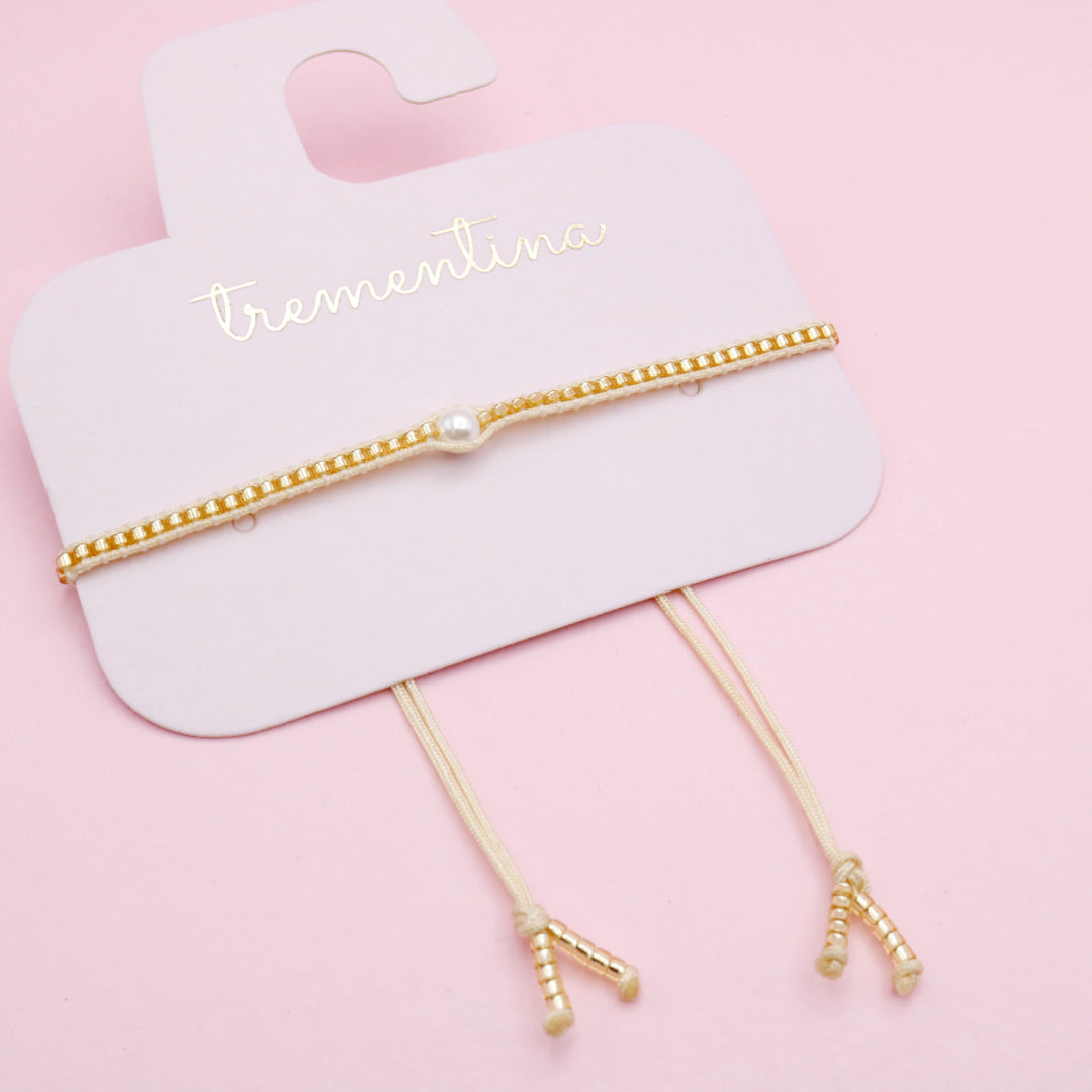 Esta pulsera tejida combina mostacillas en tonos Dorado y una perla central que aporta equilibrio y elegancia. Es sutil, femenina y perfecta para usar todos los días.