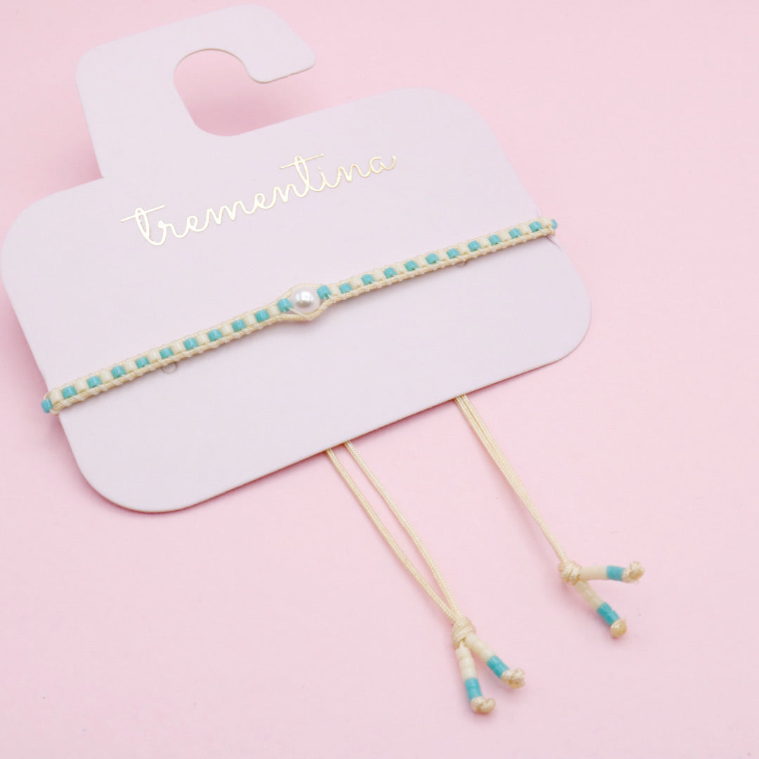 Esta pulsera tejida combina mostacillas en tono turquesa suave con base marfil y una perla central que aporta equilibrio y elegancia. Es sutil, femenina y perfecta para usar todos los días.