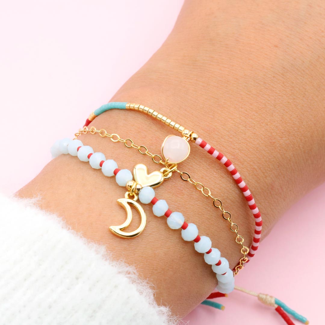 - Pulsera elaborada con mostacillas de color y cadena dorada, con dijes de corazón y luna en baño de oro y cuarzo rosa.