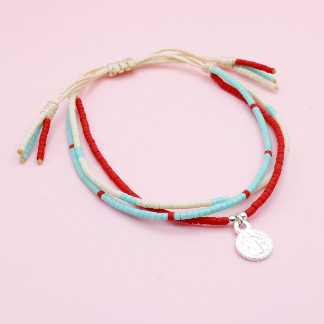 Pulsera triple hecha a mano con mostacillas en tonos rojo, marfil y turquesa, con medalla de San Benito en tono plata. Cuenta con ajuste corredizo que permite adaptarla cómodamente a la muñeca. Un diseño ligero, simbólico y fácil de combinar, ideal para uso diario o como regalo con intención.