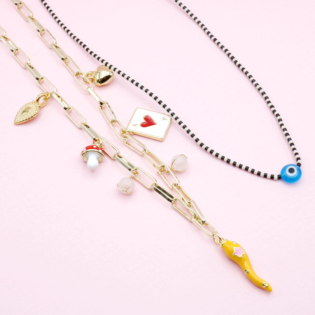 Un collar lleno de pequeños símbolos que cuentan historias: protección, suerte y juego. Su mezcla de dijes lo hace especial, diferente y perfecto para quienes disfrutan los detalles con intención y un toque divertido.