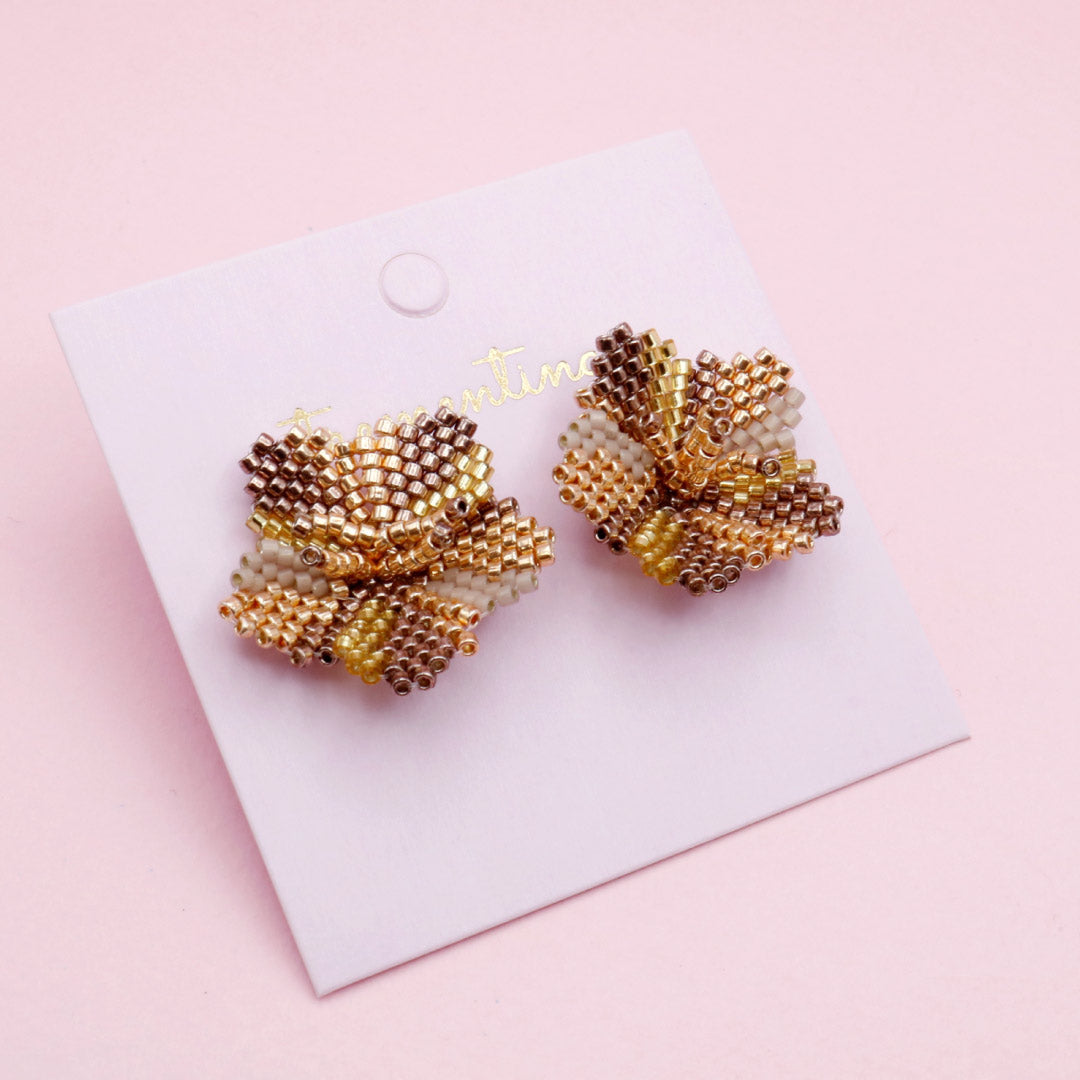 Estos topos en forma de flor están tejidos a mano en mostacilla Miyuki en tonos tierra, creando un diseño con textura y volumen que ilumina el rostro al instante.