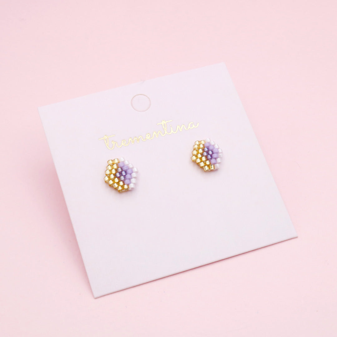 Estos topos en forma de rombo están tejidos a mano en mostacilla Miyuki en tonos lila, blanco y dorado, creando un efecto geométrico delicado pero protagonista.